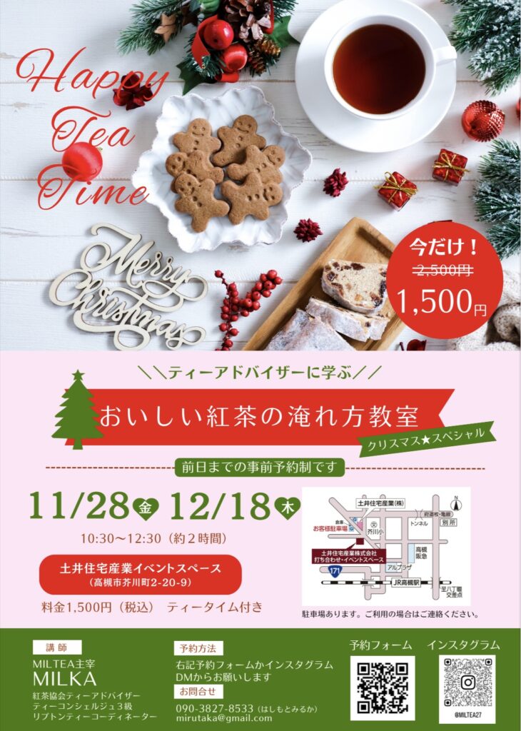 ティーアドバイザーが紅茶のおいしい淹れ方を教えます。クリスマスバージョンで開催します。