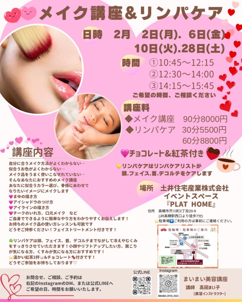 【2月2日(月).6日(金).10日(火).28日(土)開催】メイク講座💄&リンパケア🍀