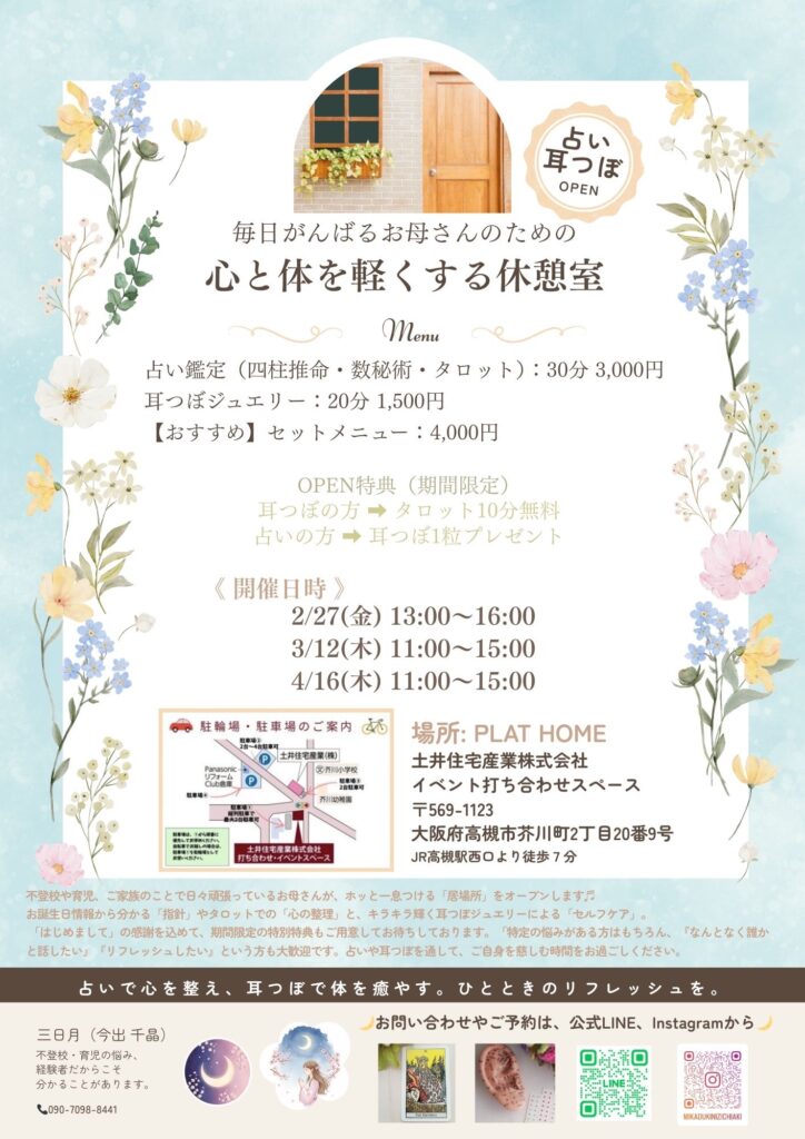 特定の悩みがある方はもちろん、『なんとなく誰かと話したい』『リフレッシュしたい』という方も大歓迎です。占いや耳つぼを通して、ご自身を慈しむ時間をお過ごしください。