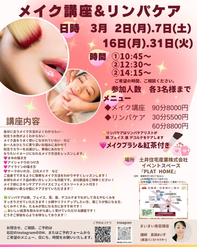 【3月2日(月).7日(土).16日(月).31日(火)開催】メイク講座💄&リンパケア🍀
