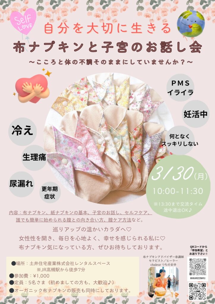 【3月30日(月)開催】自分を大切に生きる布ナプキンと子宮のお話し会💐