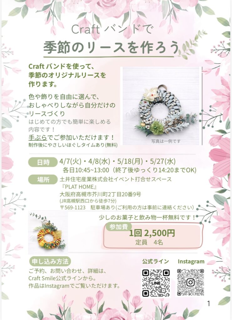 Craftバンドを使って季節のリースを作る、初心者向けの少人数レッスンです。